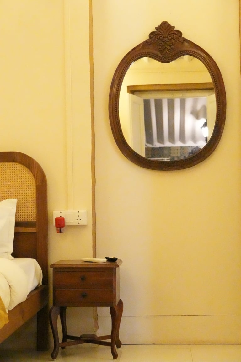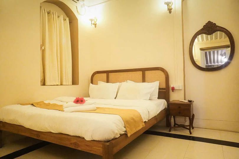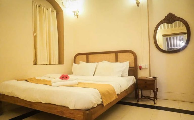 A cozy vintage-style room with a king-size bed, AC, TV, and attached bathroom — perfect for a comfortable and relaxing stay.